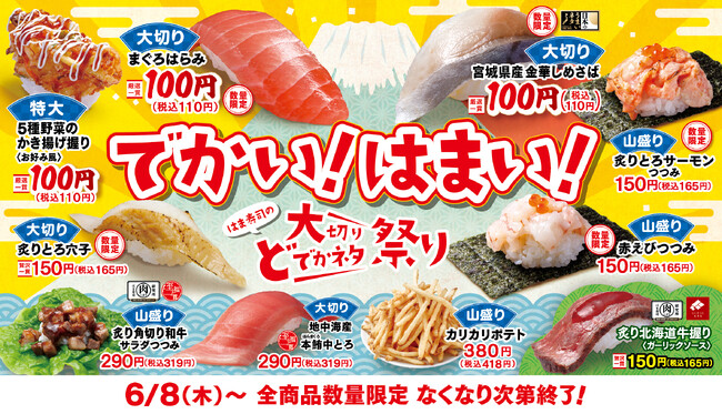 株式会社はま寿司(代表取締役社長:遠藤 哲郎 本社:東京都港区)が展開する100円寿司チェーン「はま寿司」は、6月8日(木)から、「はま寿司の大切りどでかネタ祭り」を全国の店舗で開催します。