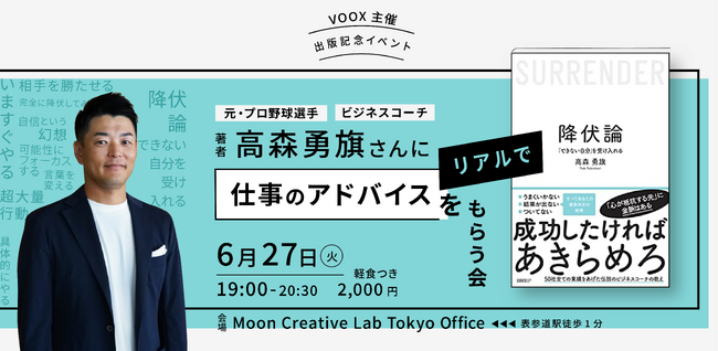 6月1日に発売された『降伏論』は、仕事の成果を出すための仕事への向き合い方を紹介した本です。本書は、音声メディア「VOOX」での高森勇旗さんのお話が元で誕生しました。本書の発売を記念し、著者である高森勇旗さんが参加者の皆さんからの仕事の悩み相談に答える、そんなイベントを開催します!