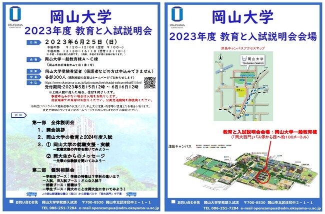 国立大学法人岡山大学(本部:岡山市北区、学長:那須保友)では、2023年6月25日(日)に「2023年度教育と入試説明会」を本学津島キャンパスの一般教育棟A~C棟にて来学方式で開催します。