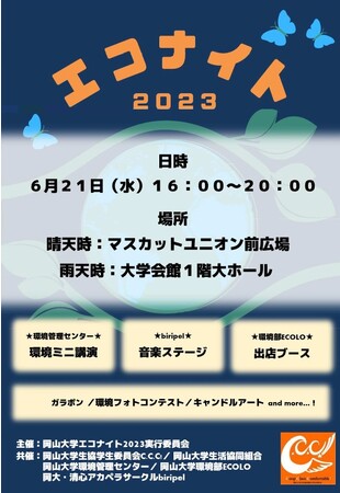 このたび、学生有志の岡山大学エコナイト2023実行委員会が企画の下、「岡山大学エコナイト2023」を2023年6月21日(水)16:00~20:00に開催いたします。