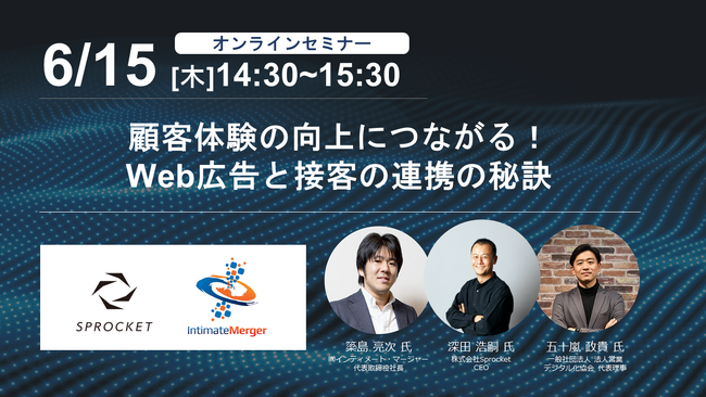 「テクノロジーで、人と企業が高め合う関係を作る」をミッションに、CRO(コンバージョンレート率最適化)のためのプラットフォームを提供する株式会社Sprocket(本社:東京都目黒区、代表取締役:深田 浩嗣)は、株式会社インティメート・マージャー(本社:東京都港区、代表取締役社長:簗島 亮次)と共催で、無料オンラインセミナー「顧客体験の向上につながる!Web広告と接客の連携の秘訣」を開催いたします。