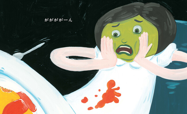 女の子のショックがレストランをとびだし、街全体へと広がっていく……。説明文のない擬音だけのテキストからナンセンスで奇想天外な世界を、画家・高畠那生さんが巧みに描き出しています。