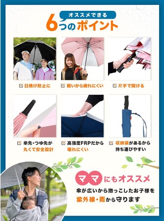 買い物や手荷物などで塞がっている時の急な雨でも片手で開けるワンプッシュボタンを採用しております。車の乗り降りの際や、お子様連れでもストレスフリーで開くことができるので、傘を刺したいけど刺せない状況を減らすことを考えております。