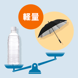 傘の骨・からつゆ先にまで軽量素材を採用した設計になっています。雨の降っていない時に持つ傘が重いと、持つだけで負担になってしまいます。そんな煩わしさを軽減できる様にと考え抜かれた軽量モデルになっており、その【重量340g】と500mlのペットボトルよりも軽いゴルフ傘に仕上がりました!
