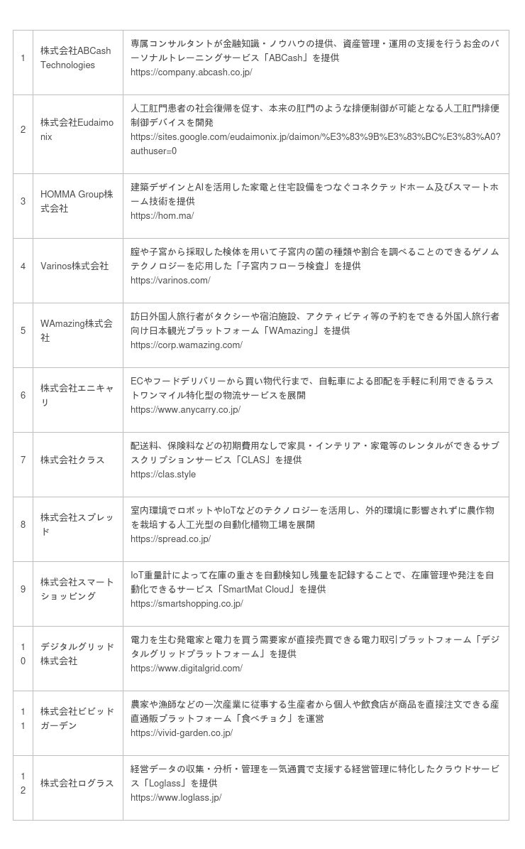 ファイナリスト12社は以下の通りです。(掲載はあいうえお順)