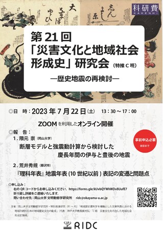 国立大学法人岡山大学(本部:岡山市北区、学長:那須保友)文明動態学研究所(RIDC)では、第21回「災害文化と地域社会形成史」研究会-歴史地震の再検討-を、2023年7月22日(土)13:30~17:00にオンラインで開催します。
