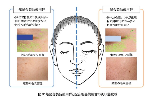さらに、対象者の全顔撮影による結果と前回(*)および今回の測定結果から、無添加のスキンケア製品を早期から継続的に使用すると、シワやキメ、毛穴の目立ちを低減していつまでも若々しい肌を保つことにつながることへの期待が考えられます(図3参照)。
