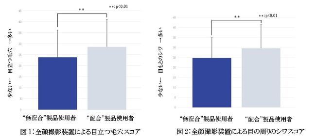 その結果、「無配合製品使用群」は「配合製品使用群」と比較し、毛穴スコアとシワスコアの両スコアとも有意に低く、毛穴の目立ちや目の周りのシワが少ないことが確認されました(図1、図2参照)。