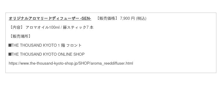 関連URL https://www.the-thousand-kyoto-shop.jp/SHOP/aroma_reeddiffuser.html