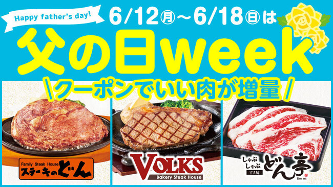 「ステーキのどん」「しゃぶしゃぶどん亭」「フォルクス」全店舗にて6月12日(月)~1週間の「父の日ウィーククーポンキャンペーン」を開催!!~美味しいお肉をみんなでたっぷり食べて元気に!~