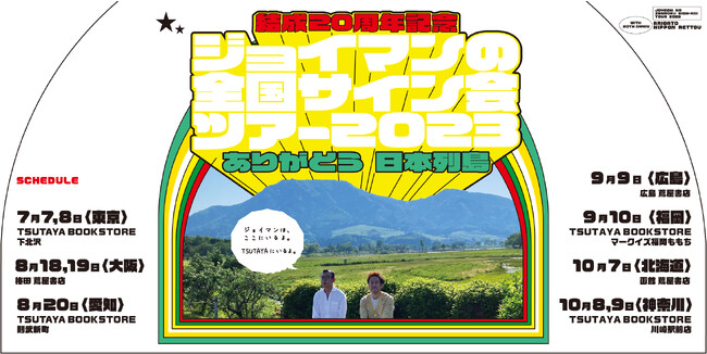 カルチュア・コンビニエンス・クラブ株式会社(本社:東京都渋谷区、代表取締役社長兼COO:高橋誉則)は、お笑いコンビ「ジョイマン」の結成20周年記念「ジョイマンの全国サイン会ツアー2023 ありがとう 日本列島」を全国7都市の蔦屋書店・TSUTAYAで7月7日(金)より順次開催いたします。