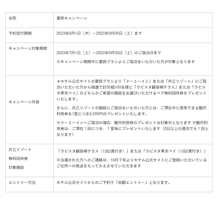 本キャンペーンは、2023年7月1日(土)~9月30日(土)までの期間中に、ホテル公式サイトの夏旅プランより「ドーミーイン」または「共立リゾート」にご宿泊いただいた方の中から抽選で、「ラビスタ観音崎テラス」または「ラビスタ東京ベイ」のどちらかご希望の施設をお選びいただけるペア無料招待券を、計50組100名様にプレゼントいたします。