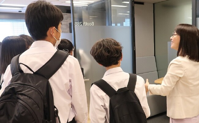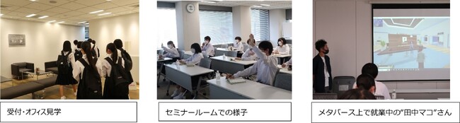 課外授業では、オフィス見学のほか、創業者の思い、会社概要、派遣というはたらき方の特徴や仕事内容の説明を行いました。また昨今、注目が集まる“メタバース”を活用した新しいはたらき方について、パーソルマーケティング メタバースデザイン事業部 部長 川内 浩司より、メタバースの概要説明やGAIA TOWN内のオフィス見学を行いました。生徒から、メタバース上でアバターとして就業している“田中マコさん(アバター名)”に質問するなど、最先端の働き方に触れ、有意義な時間を過ごしていただきました。