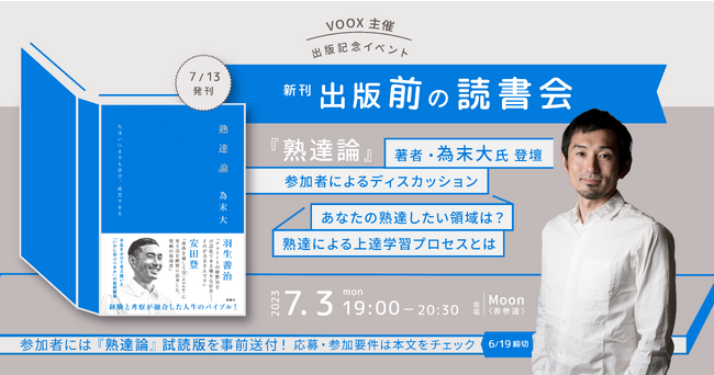 2023年7月13日に発売される『熟達論』は、音声メディア「VOOX」での為末大さんのお話が元で誕生しました。本書の発売前に、著者である為末大さんと『熟達』についてディスカッションできる読者参加型イベントを開催します!