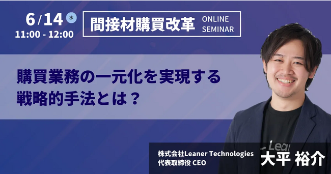 調達管理プラットフォーム「Leaner見積」を提供する株式会社Leaner Technologies(本社:東京都品川区、代表取締役:大平裕介)は、間接材の購買改革をテーマとした無料オンラインセミナーを開催いたします。