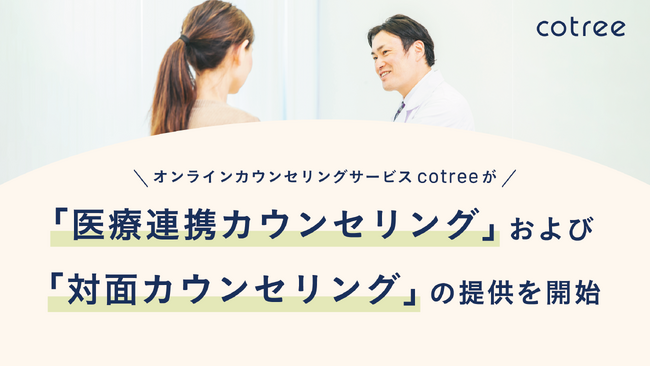 オンラインカウンセリング・コーチングの「cotree」を展開する株式会社cotree(本社:東京都港区、代表取締役:西岡 恵子、以下cotree)は、メンタルヘルスの課題を解決する新たなサービスとして、「医療連携カウンセリング」および「対面カウンセリング」の提供を開始します。