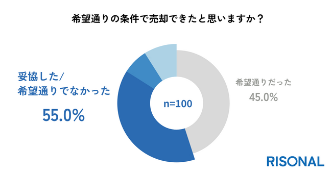 希望通りの条件で売却ができたか尋ねたところ、「希望通りだった」が45.0%、「少し妥協したが許容範囲だった(39.0%)」が39.0%、「かなり妥協した(7.0%)」「全く希望通りではなかった(9.0%)」は合わせて55.0%と、希望通りに売却できた人とそうでなかった人の割合は約半数ずつという結果になり、希望通りの条件で売却できた人ははわずか半数以下にとどまることがわかりました(n=100)。