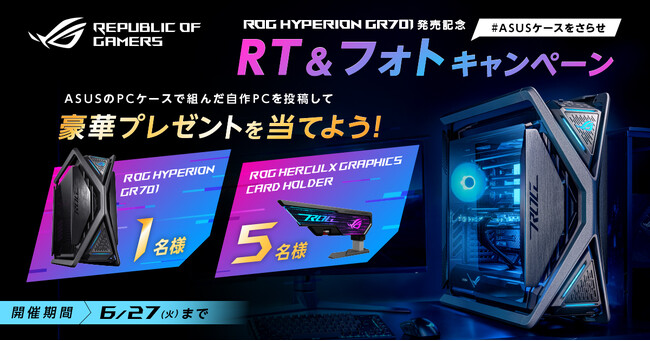 ASUS JAPAN株式会社は、ASUSのゲーミングブランドRepublic Of GamersのROG Hyperion GR701発売を記念して、ASUSのPCケースで組んだ自作PCの写真を投稿し豪華賞品が手に入る「#ASUSケースをさらせ RT & フォトキャンペーン」の開催を発表しました。