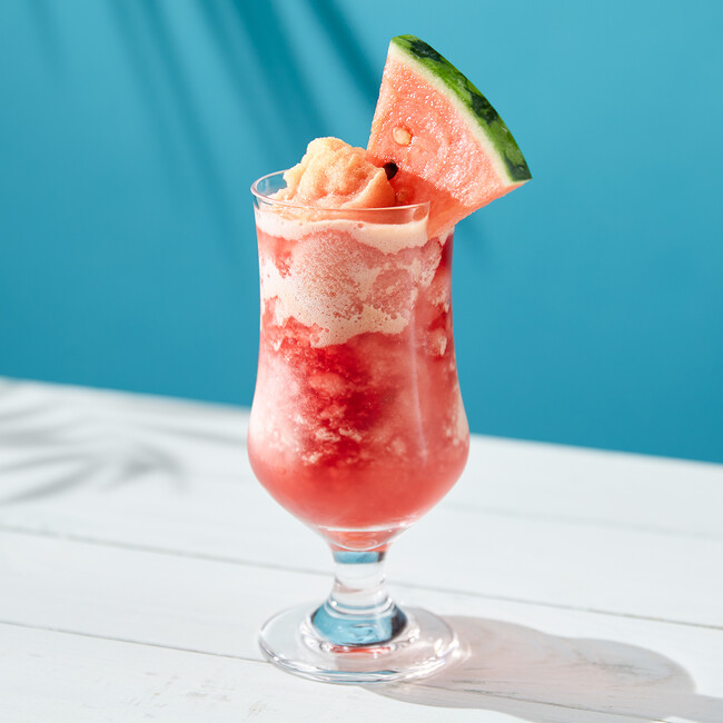 スイカの香りやハイビスカスのほんのりとした酸味、ビーツとローズヒップなどの味わいが重なるティバーナ(TM)の夏の風物詩『トロピカルアドベンチャー』を使用した、まるで常夏のリゾートに訪れた気分にさせてくれる一杯。パッションフルーツやマンゴーなどのトロピカルフルーツを組み合わせた、見た目も味わいも楽しめる「ティバーナ(TM) フローズン」。