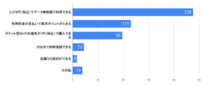 また、「利用料金の支払いで楽天ポイントがたまる」や「ポケット型Wi-Fiの端末が1円(税込)で購入できる」と回答している方も多いため、料金に関して魅力を感じる方が多いようです。
