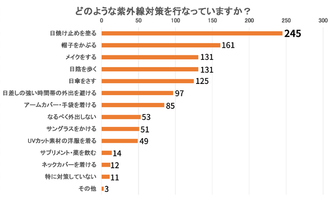 「どのような紫外線対策を行なっていますか?」という質問では、「日焼け止めを塗る」が245票を集め、「帽子をかぶる」161票、「メイクをする」「日陰を歩く」131票が続きました。