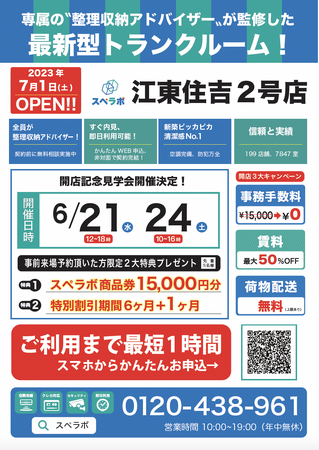 【江東住吉2号店/7月1日(土)オープン】見学から契約、解約まで完全非接触・非対面、お申し込みからご利用まで最短1時間!都内、大阪などにて絶賛運営中のトランクルーム【スペラボ】が住吉駅近くに出店!