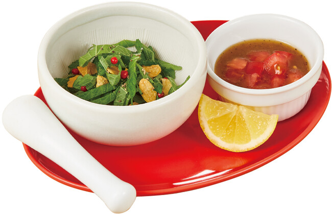 初登場の“オリジナル香草ソース”は、お客様自身で完成させていただくステーキソースです。まず、すり鉢に入ったガーリックオイルや大葉、ピンクペッパーなどをすって、ふわっと広がるスパイシーかつ華やかな香りをお楽しみください。そこに、トマトサルサが入ったさっぱりとした味わいの旨塩だれと、レモンをひと絞りすればステーキの濃厚な旨みと相性抜群のソースの完成です。食材をする回数や、旨塩だれの量を調整して自分好みの味に仕上げてお召し上がりください。にんにくのきいた醤油ベースの“特製ステーキソース”もあわせてお楽しみください。