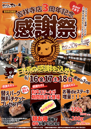 行かなきゃ損!なキャンペーンが目白押し【やっぱりステーキ吉祥寺店】3周年!感謝の気持ちを込めて記念感謝祭を開催します