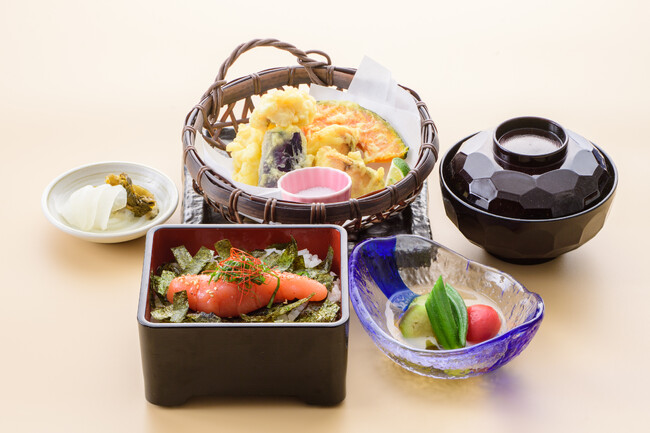 知る人ぞ知る博多名物明太子重と、まさに今が旬のお魚・野菜をふんだんに盛り込んだ御膳です。