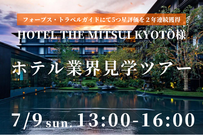 京都ホテル観光ブライダル専門学校は、2023年7月9日(日)に産学連携の一環として高校生を対象とした「ホテル業界見学ツアー 」を開催します。今回はHOTEL THE MITSUI KYOTO様で行う学外イベントです。参加者のみなさまには館内施設見学をお楽しみいただき、ホテルのお仕事やホテル業界の魅力について知っていただく機会を提供いたします。