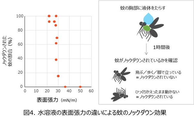 さらに、表面張力がより低い液体を蚊に付着させることで、蚊をノックダウン状態にまで至らせることができることがわかりました(図4)。