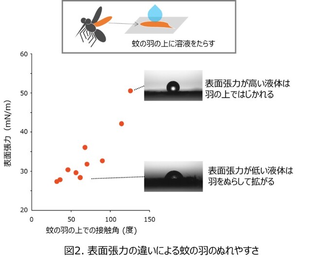 水を蚊に噴霧しても、蚊は水をはじくため飛行行動に影響が出ることはありません。しかし、効率的に蚊の表面をぬらすことができる界面活性剤水溶液は、ミスト状に噴霧して吹きかけるだけで簡単に蚊を落下させることができることを発見しました。