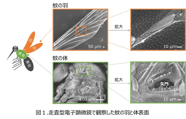 花王は今回、「蚊の飛行を妨げる、飛べなくする」ことをめざして技術開発に取り組みました。そこで注目したのが、蚊の体表面や羽です。蚊の体の表面(図1)は、非常に細かい凹凸のある構造でワックスなどの疎水性の成分で覆われており、極めて水になじみにくいという特徴があります。そのため、蚊の羽や体の表面は水をはじき、雨でもぬれることなく、水場で産卵・羽化することができます。