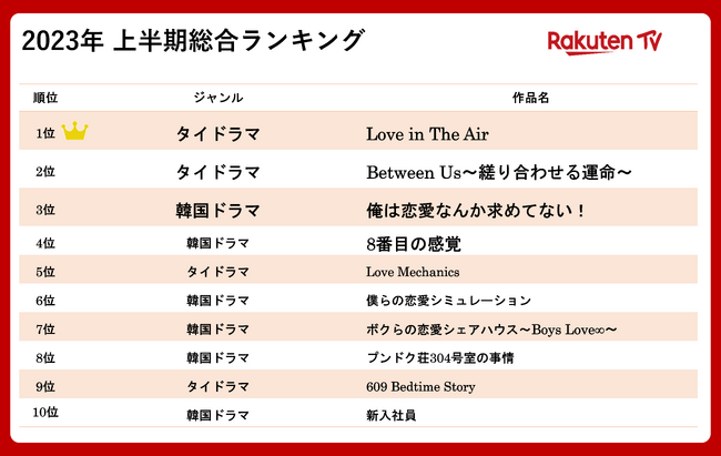 タイドラマと韓国ドラマがトップ10を独占し、全作品が「BL」ドラマという結果に。SNSでも瞬く間に話題となった『Love in The Air』が1位にランクインし、引き続き「BL」コンテンツが人気傾向