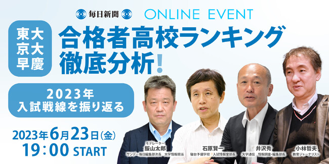 毎日新聞社(代表取締役社長執行役員:松木健)は、6月23日(金)午後7時からオンラインイベント「東大・京大・早慶合格者高校ランキング徹底分析!~2023年入試戦線を振り返る~」を開催します。週刊誌「サンデー毎日」の名物特集と言えば、東大・京大・早慶などの大学合格者高校別ランキング。2023年大学入試戦線の振り返りと24年の展望、難関大学の合格者数上位校の勢力図の変化について、特集を担当する編集者が大手予備校や専門家ら「分析のプロ」と語り尽くします。ぜひ、ご覧ください。