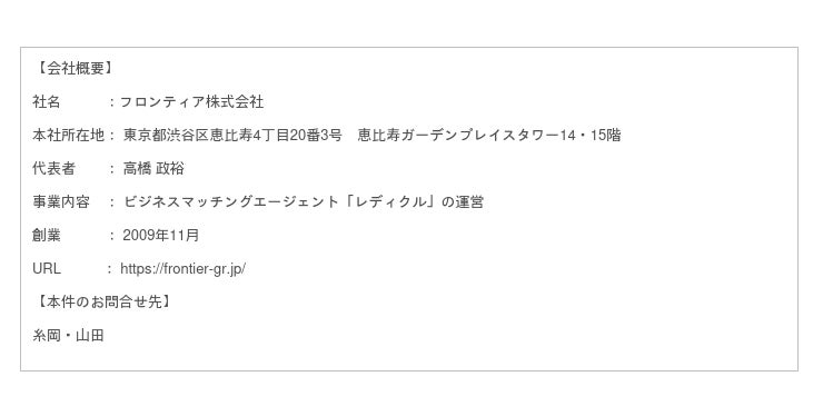 ビジネスマッチングエージェント「Ready Crew(レディクル)」を運営する、フロンティア株式会社(本社:東京都渋谷区、代表取締役:高橋 政裕、以下 当社)は、「第13回コンテンツ東京」内、「第9回広告クリエイティブ・マーケティングEXPO」に出展いたします。