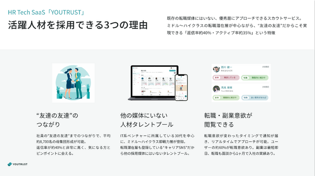 YOUTRUSTは自社の社員のつながりを経由し候補者にアプローチすることができるサービスです。ユーザー向けにはキャリアSNSを展開しているため、通常の転職サービスには登録していない方も多くいらっしゃいます。ユーザーの転職意欲がリアルタイムでわかるため、意欲に合わせたアプローチでスカウト返信率は約40%と、優秀な人材と出会える可能性が高くなっております。