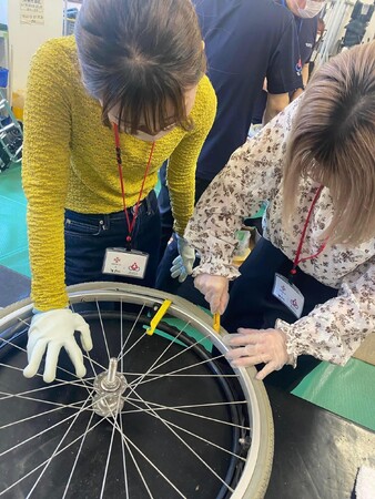 また、その後ボランティアさんと一緒に車いす修理の体験をしました。