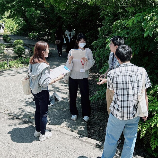 その後、学生たちはグループに分かれ、フィールドワークを開始。事前授業で準備した質問内容などに基づき、ボランティアの方々に、始めたきっかけや、なぜ続けているのか、WAFCAの魅力などをインタビューしました。