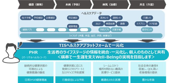 TISは事業を通じて解決をめざす社会課題の一つとして「健康問題」を掲げ、医療機関を中心に管理されている医療健康データを、健康増進に活用できるようにPHR※として整備するヘルスケアプラットフォームを提供しています。TISはヘルスケアプラットフォームを通じて培ったノウハウとデジタル技術を活かし、データ利活用のためのガイドライン整備に貢献するとともに、PHRサービスを提供するIT事業者として標準化を促進する役割を担う事で、PHRサービス産業の発展に貢献していきます。