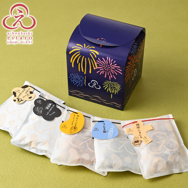 【夏だけのお手土産】花火の絵柄箱にこだわりのお菓子を詰めた「にほんばしえいたろう 花火キューブBOX」が公式オンラインストアで販売中!