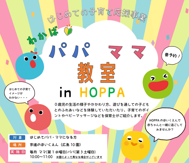 全国に95園の保育施設を展開する株式会社 京進では、広島市内にある認可保育園・小規模認可保育園全10園にて「わかばパパママ教室in HOPPA」を開講いたします。