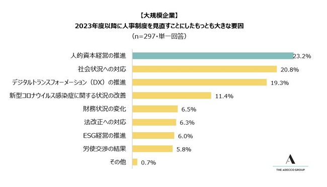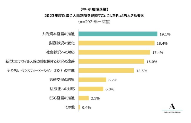 2023年度以降に人事制度を見なすことを決めた要因の1位は、中・小規模企業と大規模企業ともに「人的資本経営の推進」(中・小規模企業:19.1%、大規模企業:23.2%)となり、人的資本経営の重要性が高まっていることと、新型コロナ対応の優先順位が低くなっていることがうかがえました。