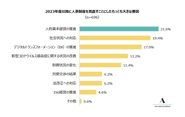 続いて、続いて、2023年度以降に人事制度を見直すと回答した696人に対し、「見直すことにした要因は何ですか?」と質問したところ、もっとも大きな要因として挙げられたのは、「人的資本経営の推進」(21.6%)でした。
