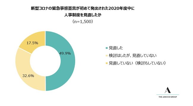 日本全国の人事担当者1,500人に対し、「あなたの勤務先では、新型コロナウイルス感染症の緊急事態宣言が初めて発出された2020年度中に、人事制度を見直しましたか?」と質問したところ、49.9%(748人)が「見直した」と回答しました。
