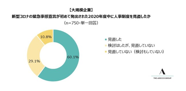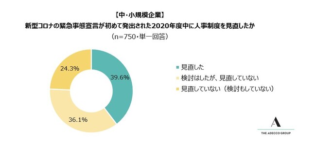 「あなたの勤務先では、新型コロナウイルス感染症の緊急事態宣言が初めて発出された2020年度中に、人事制度を見直しましたか?」という質問に対し、中・小規模企業(従業員数1,000人未満の企業)所属の人事担当者で「見直した」と答えたのは39.6%でした。一方、大規模企業(従業員数1,000人以上の企業)所属の人事担当者は、60.1%が「見直した」と回答しました。
