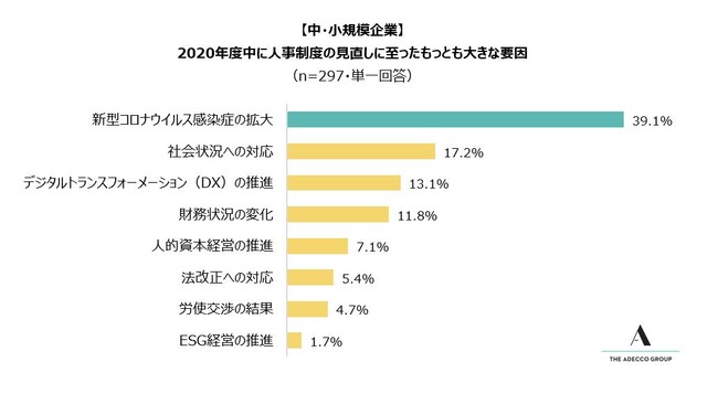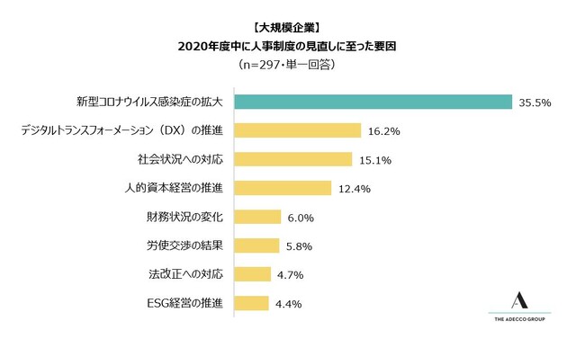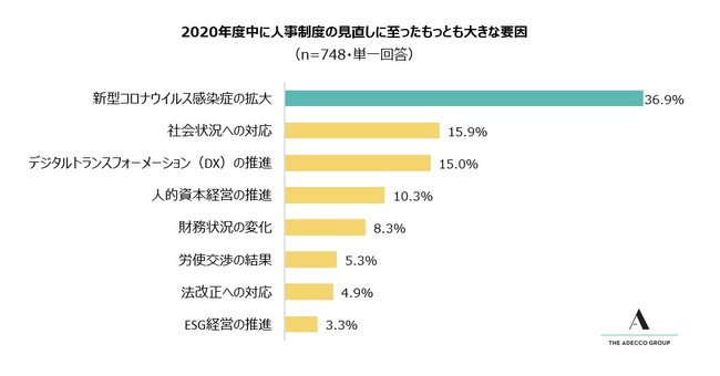 続いて、2020年度中に人事制度を見直したと回答した748人に対し、「見直しに至った要因は何ですか?」と質問したところ、もっとも大きな要因として挙げられたのは、「新型コロナウイルス感染症の拡大」(36.9%)でした。