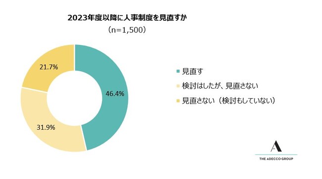 日本全国の人事担当者1,500人に対し、「あなたの勤務先では、2023年度以降に人事制度を見直しますか?」と質問したところ、46.4%(696人)が「見直す」と回答しました。