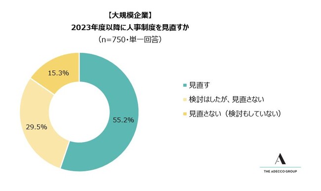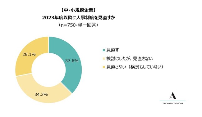 「あなたの勤務先では、2023年度以降に人事制度を見直しますか?」という質問に対し、中・小規模企業(従業員数1,000人未満の企業)所属の人事担当者で「見直す」と答えたのは37.6%でした。一方、大規模企業(従業員数1,000人以上の企業)所属の人事担当者は、55.2%が「見直す」と回答しました。