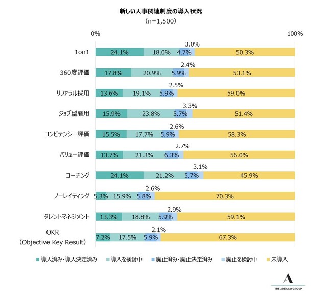 日本全国の人事担当者1,500人に対し、近年注目を集めている人事関連の制度の導入状況について質問したところ、もっとも導入されていたのは「1on1ミーティング」と「コーチング」(どちらも24.1%が「導入済み・導入決定済み」と回答)でした。